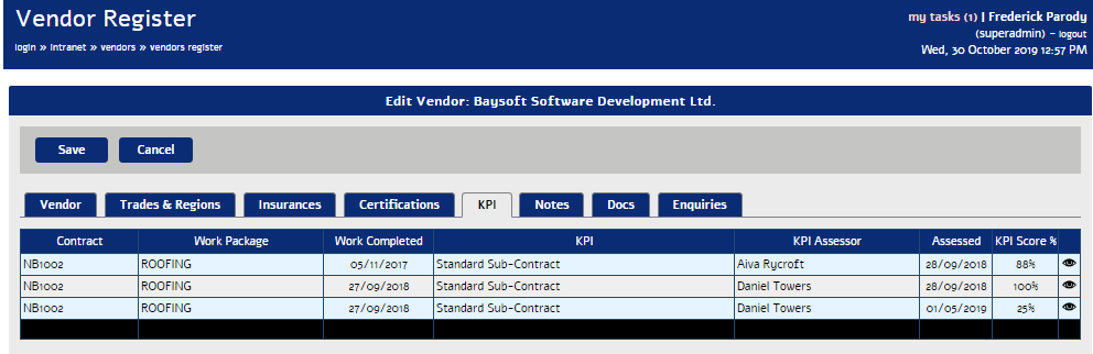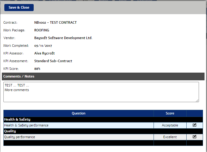 Using a custom created KPI Assessment form we get the system to request that the KPI form is scored by nominated members of staff to assess whether the job was well done or otherwise and to establish if the Vendors should be considered eligible to receive more business in the future.